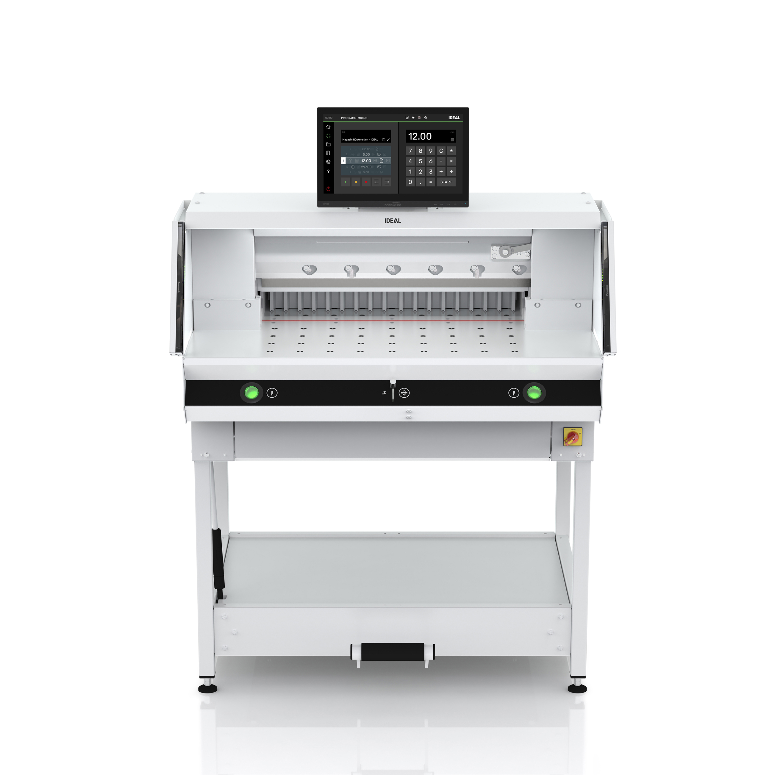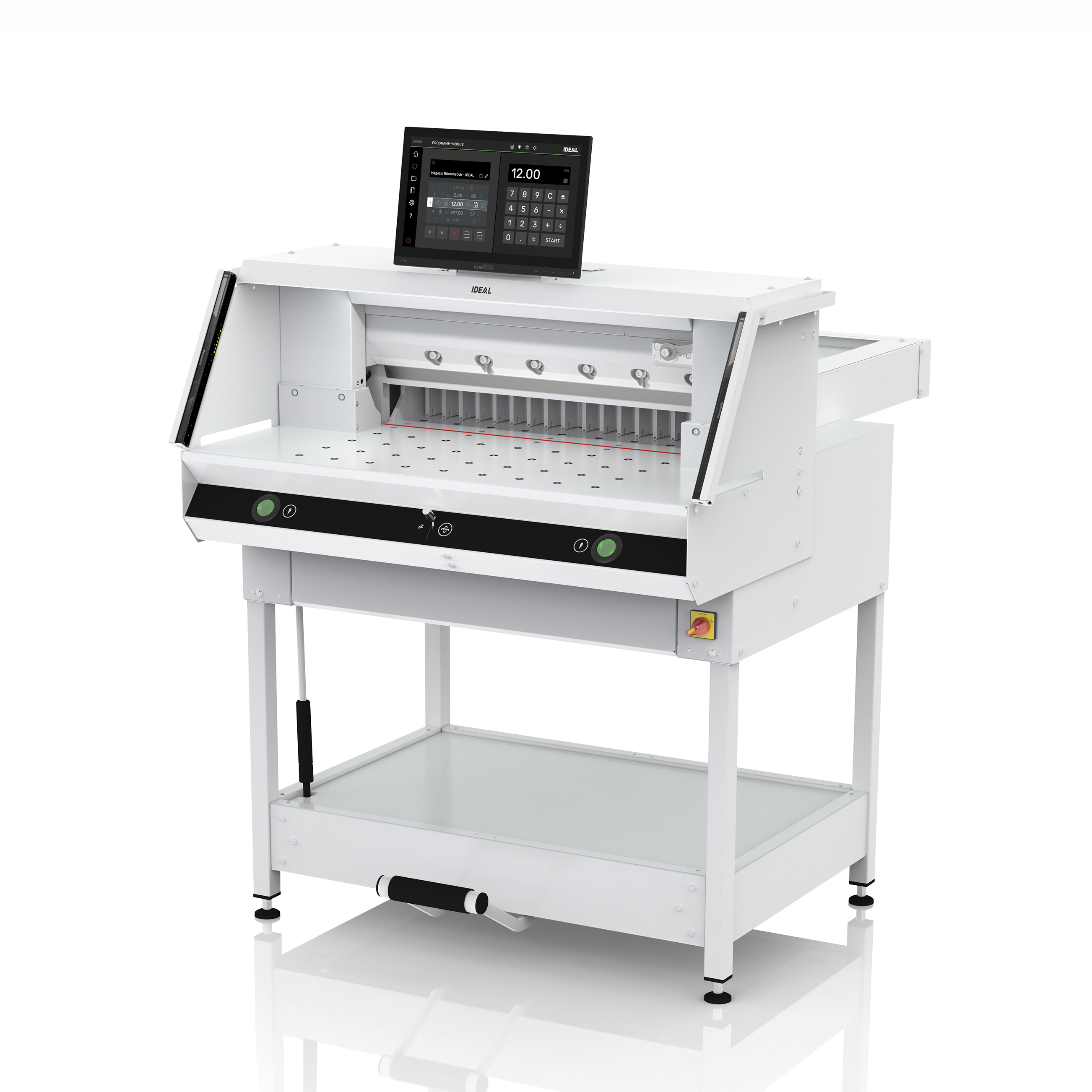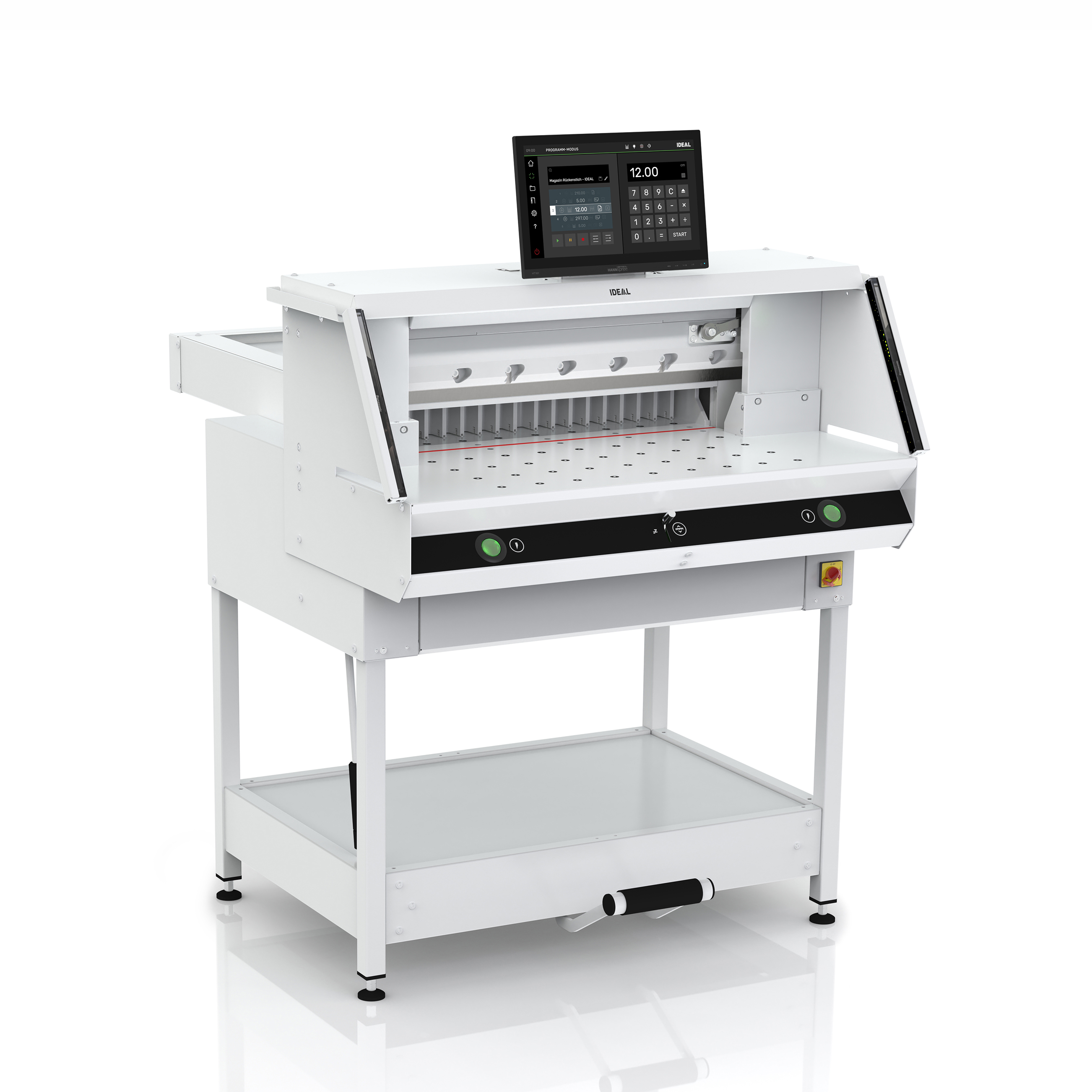 Massicot électrique avec technologie de haute précision, presse hydraulique, tables soufflantes et grand écran de commande tactile. Longueur de coupe de 680 mm.